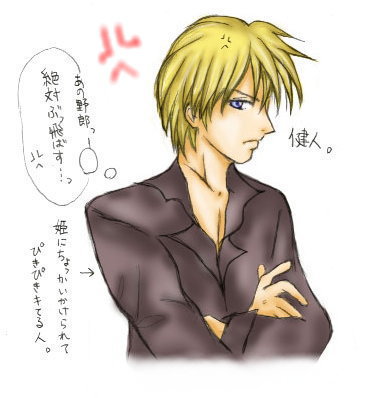:::: ご立腹。:::: えっと、バナーと拍手画像を変えたくて描いたものなので、また背景皆無ですが;怒ってる健人です(何) バナー絵なのにこんな無愛想でいいのかと思いつつ; 健人がキれる理由は姫関連かなと(笑) さすがに拍手画像は怒り顔じゃ申し訳ないと、ちょっといじって微笑させてみたんですが(笑) ちなみに拍手画像は、今はこの健人じゃないです〜。 あと、まさに拍手用に使った画像は、今後もギャラリーには載せないつもりでいます。 実は、バナーが変わったら何気に拍手画像も変わってるんですよv(使いまわしかよ) バナーに使ったのも、実はこの絵ではなく、左向きの横顔の黒い瞳Ver.な健人だったり; この絵は、やはり健人は青い瞳だろうと、反転して(笑)瞳を塗ったものです〜。 ていうか、本当にやる気ない絵でごめんなさい; |