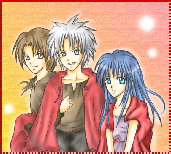 :::: さば夕・3人組 :::: ドロシーのカウンター33333を踏んでくださいました舟瀬コロさんのリクエスト絵です。 コロさんのオリジナル小説「砂漠に昇る夕陽」のメインキャラズ3人組ですv もう青い髪の女の子・ヴィスを塗るのが楽しかったですー! 真ん中の主役くん・ギンは元気な子なんですが、あまり元気っぽくないなと; でも彼のツンツン気味な髪は描いてて楽しかったです(笑) そして何気に3人の中で一番私が好きなストレイが、思い切りはじっこに; しかも出来が気に入らず、ストレイに謝りながら塗ってました(泣) 人様のキャラはかなり描くのに緊張しますが、楽しかったですv コロさん、リクエストありがとうございましたv |